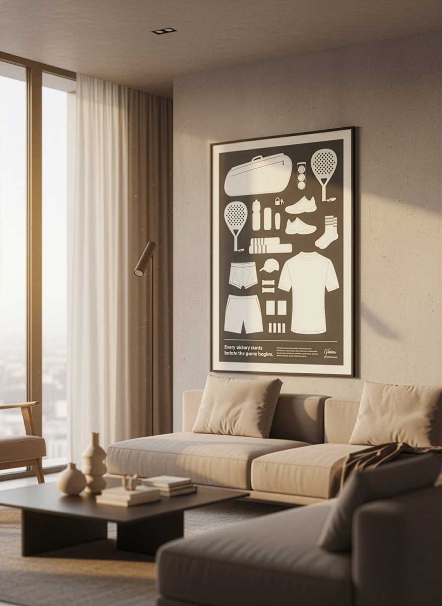 Minimalist design meets daily life. A poster in your living room or bedroom brings the spirit of padel into a calm, stylish setting — a quiet reminder of the game you love.